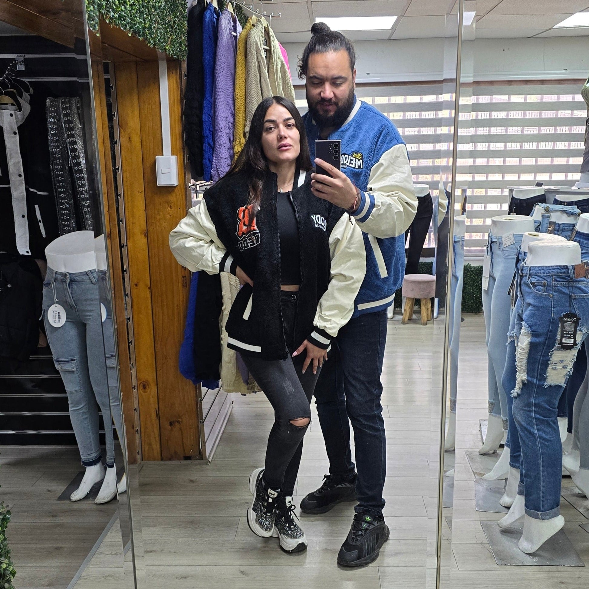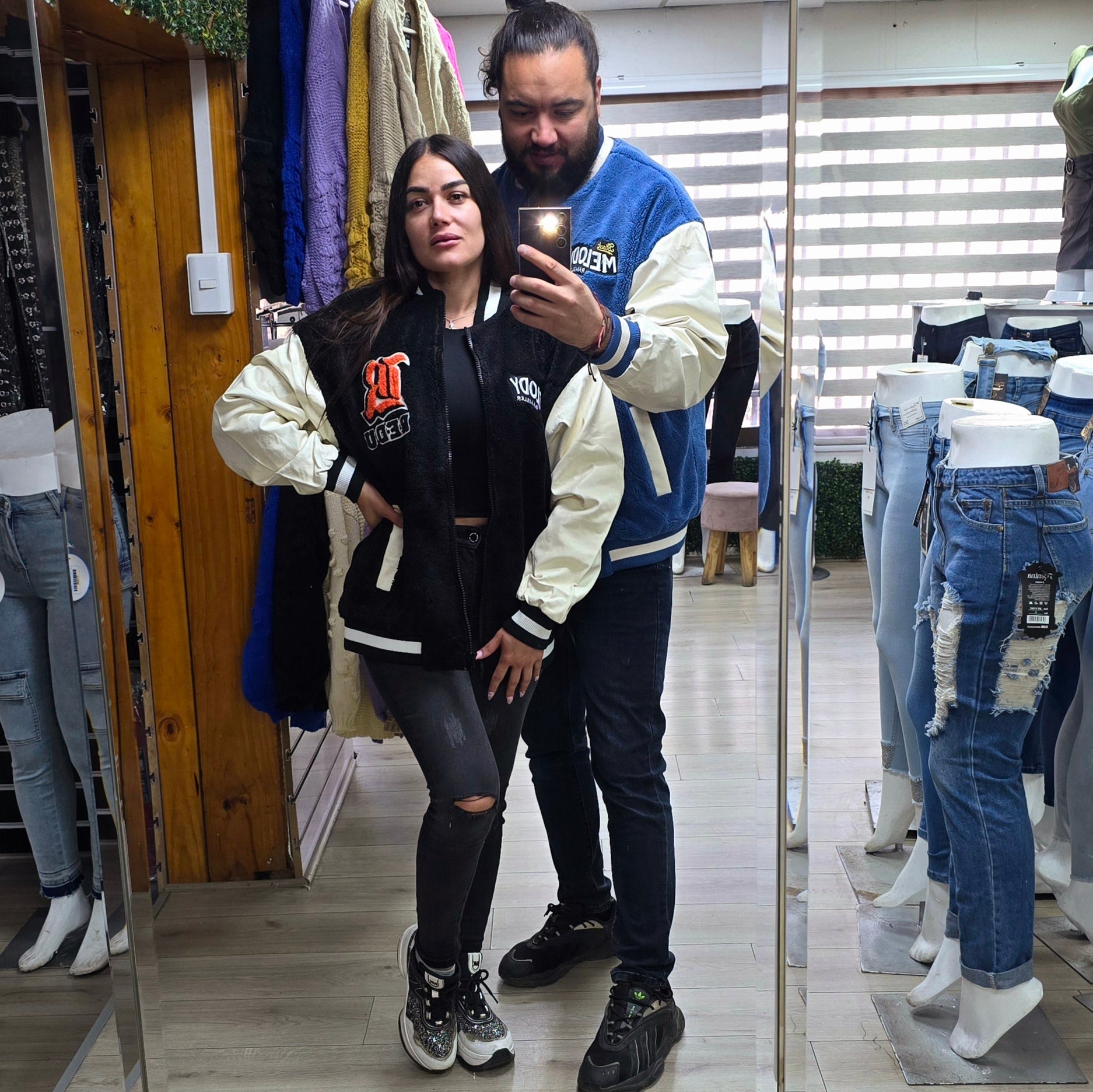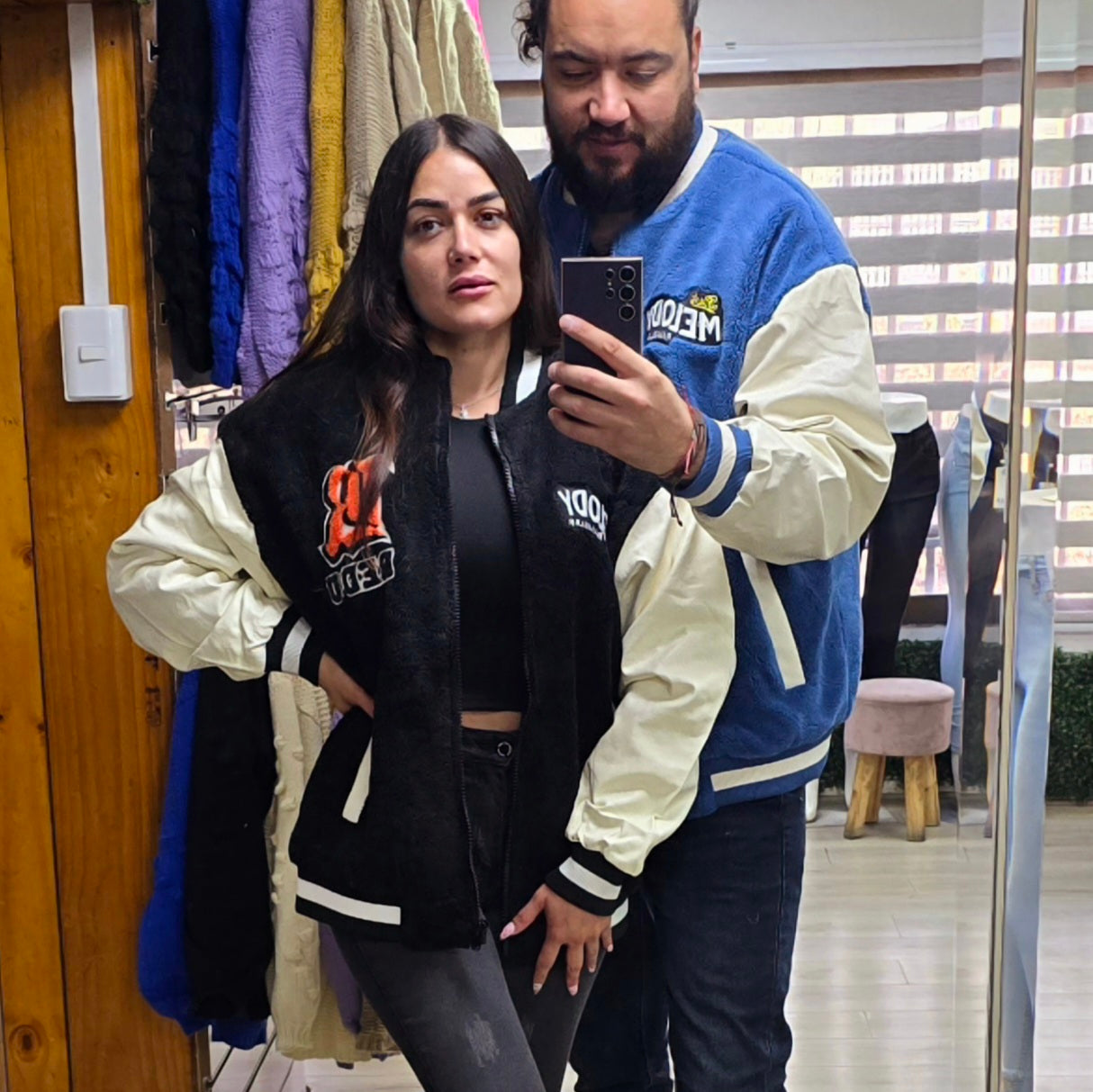 Chaqueta tipo UNIVERSITARIA, con mangas en ecocuero , gruesa, forrada en su interior, de tela peluda