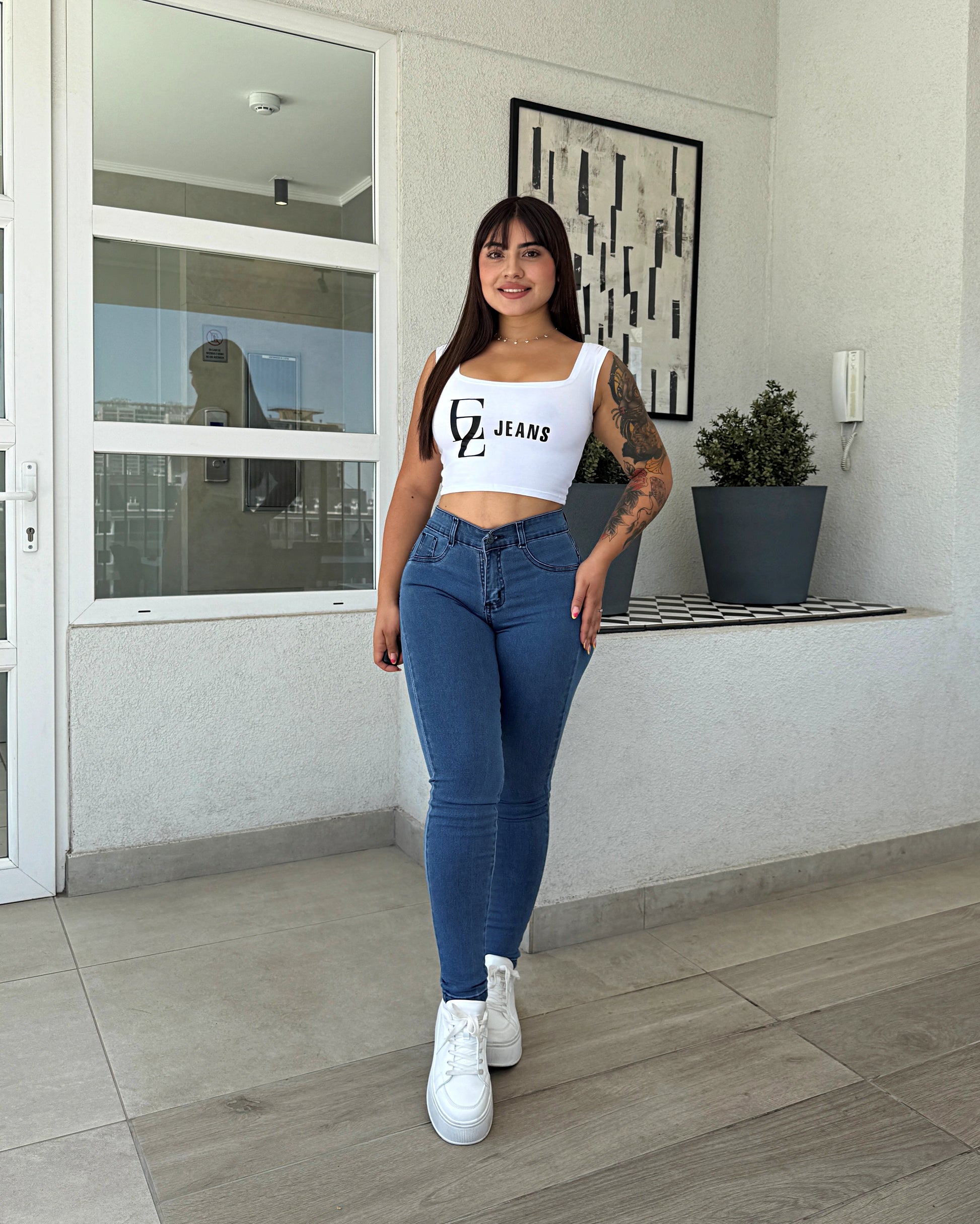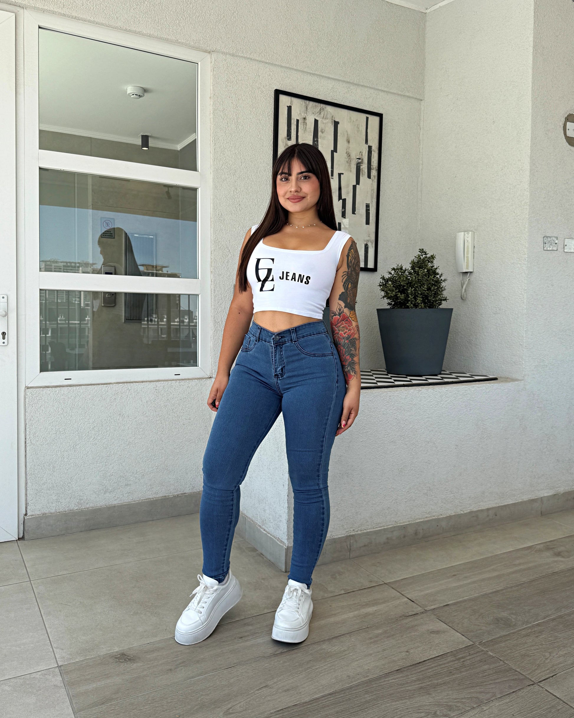 Jeans elasticado, color liso, es con ultra push up, tiene 3 pinzas por lado, ademas del corte en forma de corazon y los bolsillos ovalados.