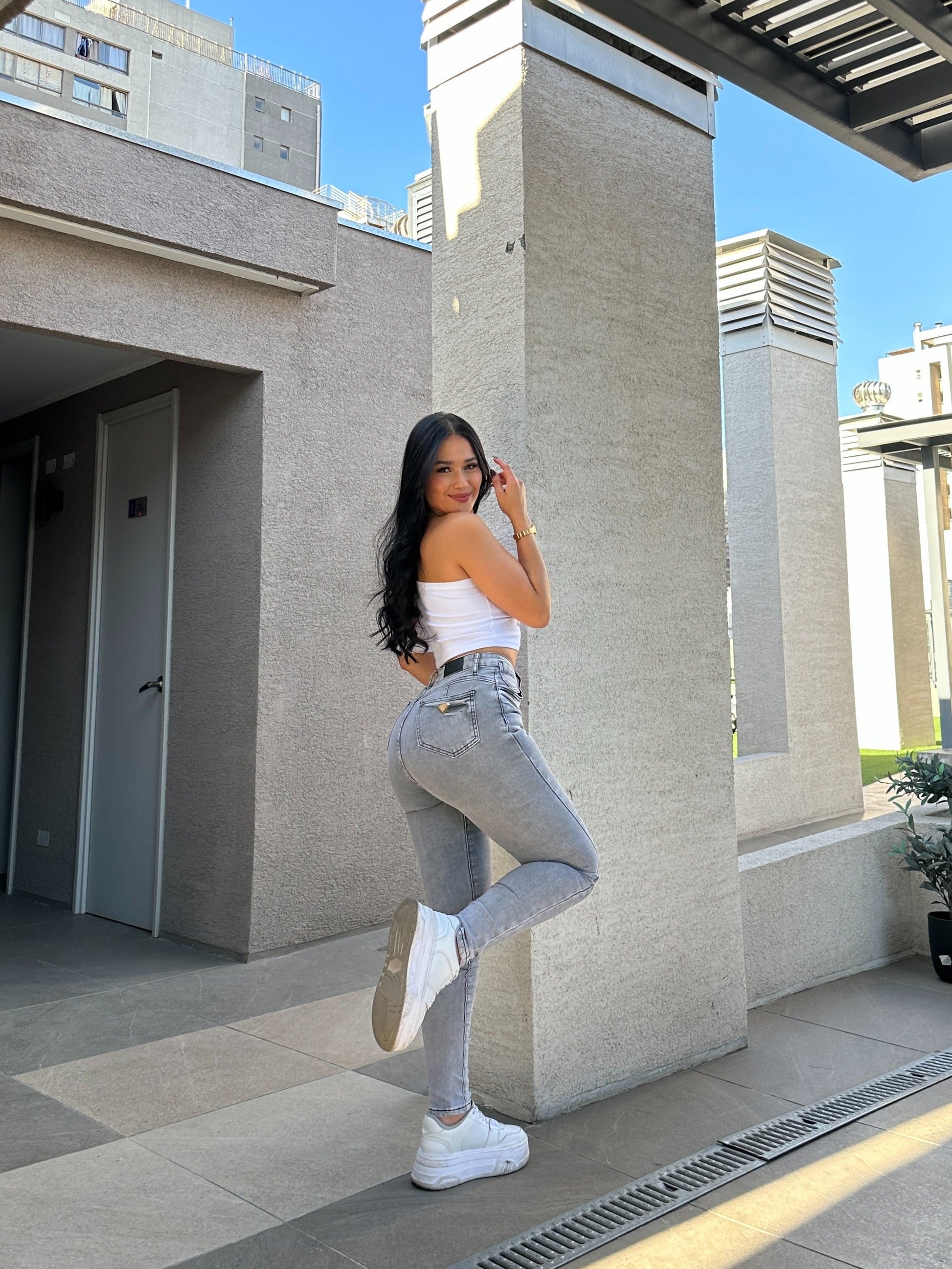 Jeans Skinny color gris, tiro alto, elasticado, full push up.
