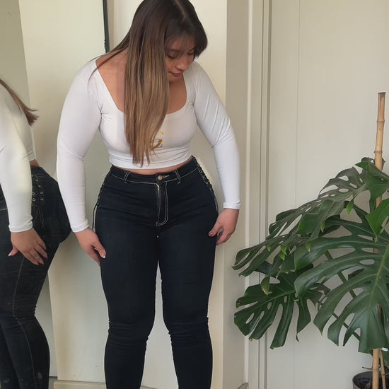 Jeans tipo Wide Leg, con brillos en los costados, es elasticado y tiro alto.