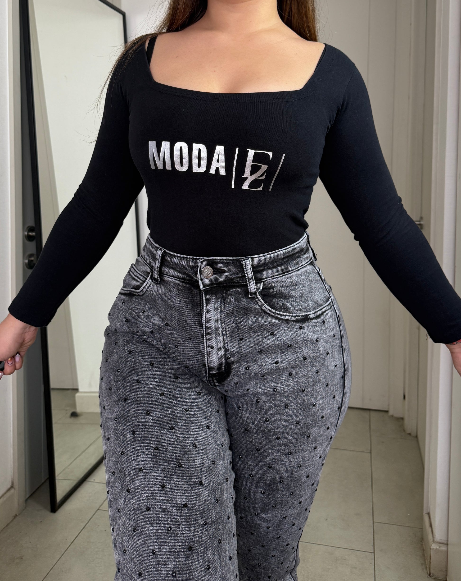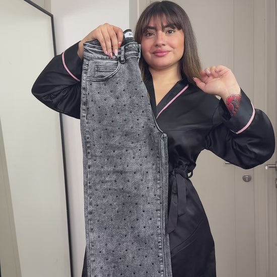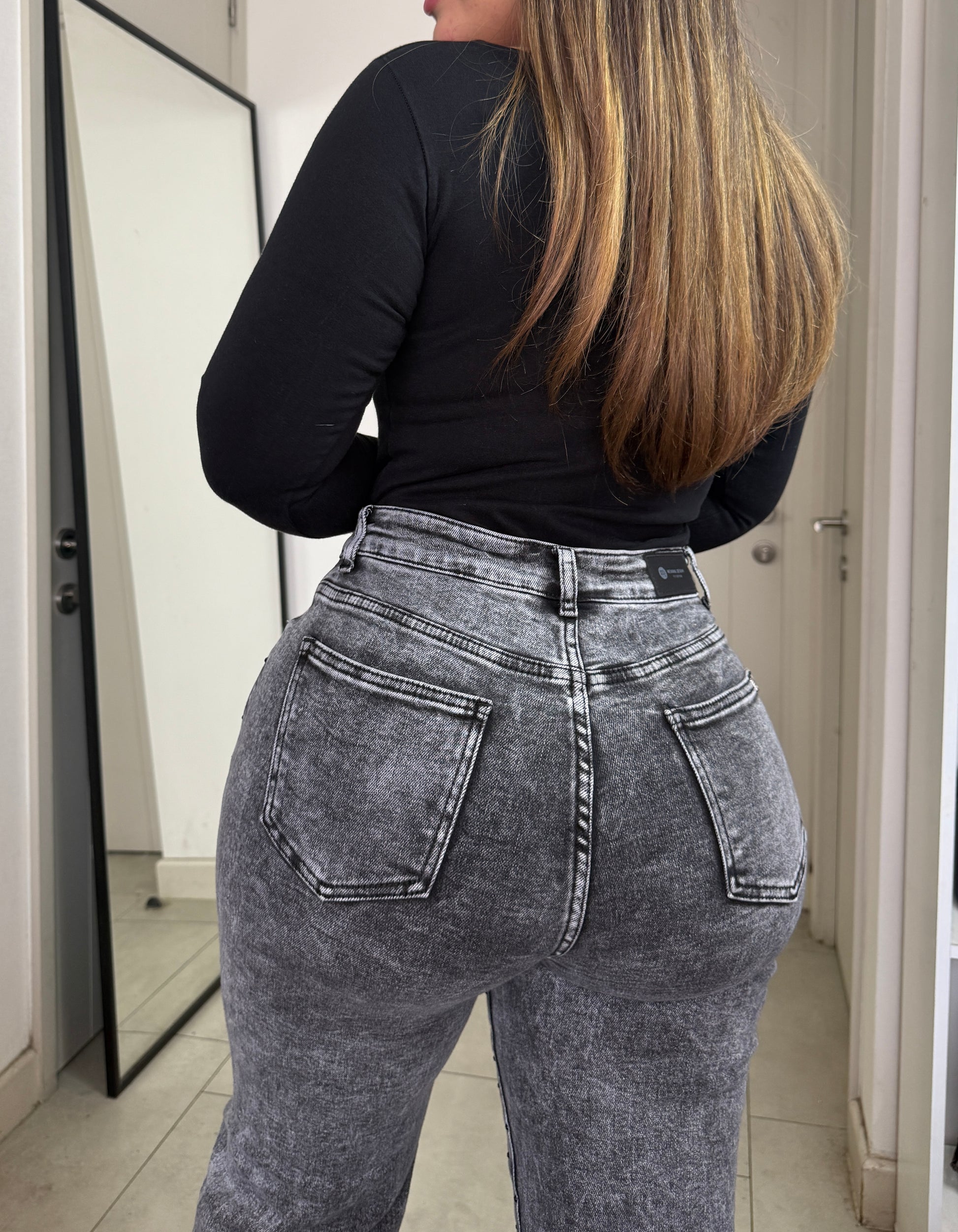 Jeans wide leg, color gris con brillos negros, es elasticado y tiro alto.
