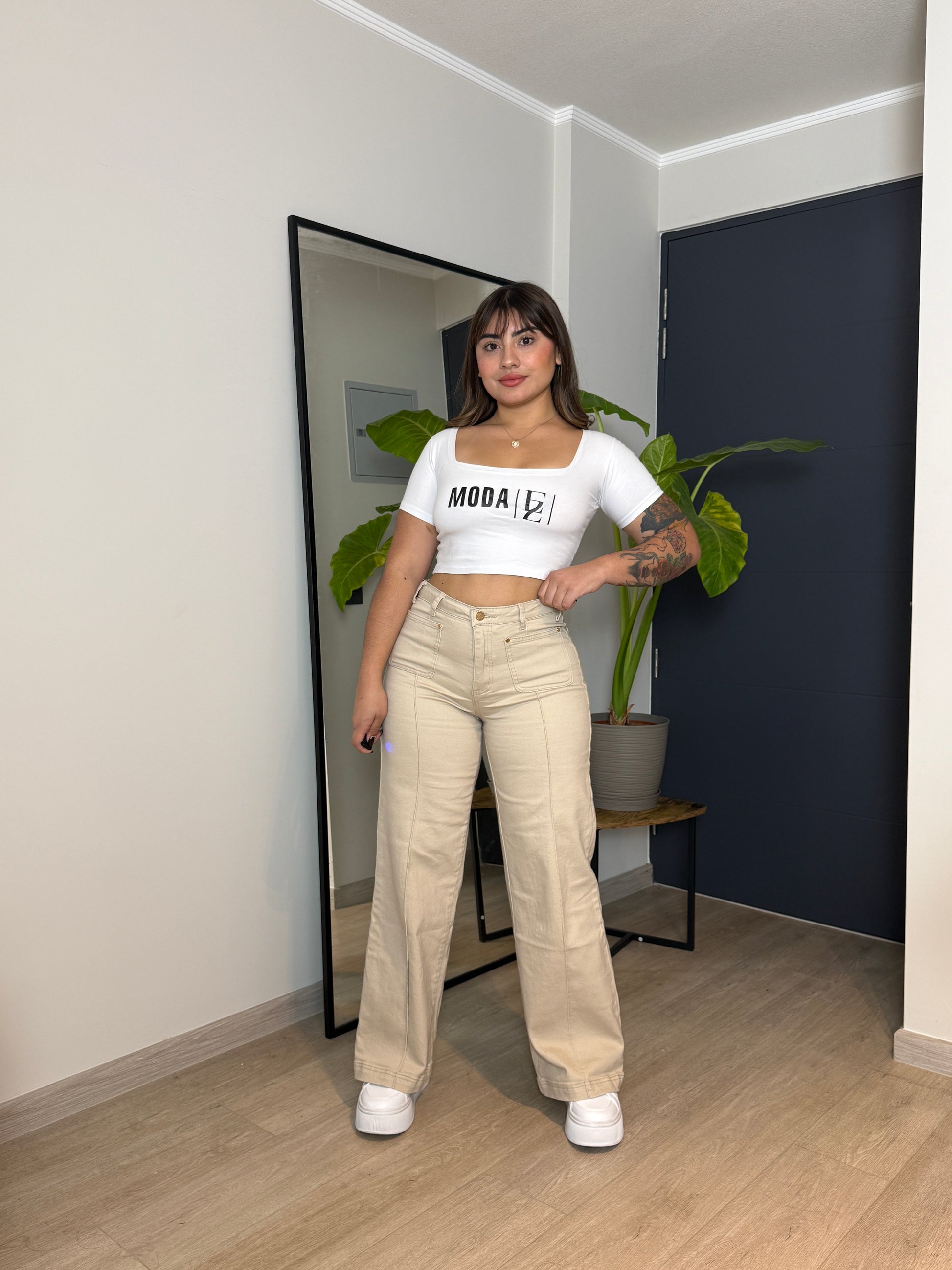 MB2001-1 (Q1) |Wide Leg Beige Lineal Bolsillos Cuadrados | Menina