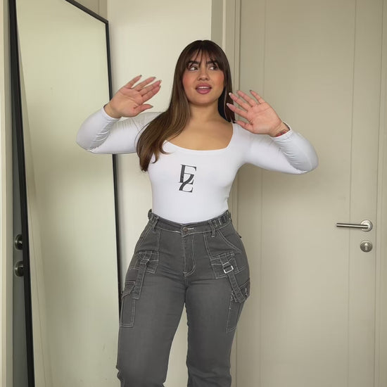 Jeans Tipo cargo ajustable, con bolsillos adelante, es elasticado, tiro alto y push up